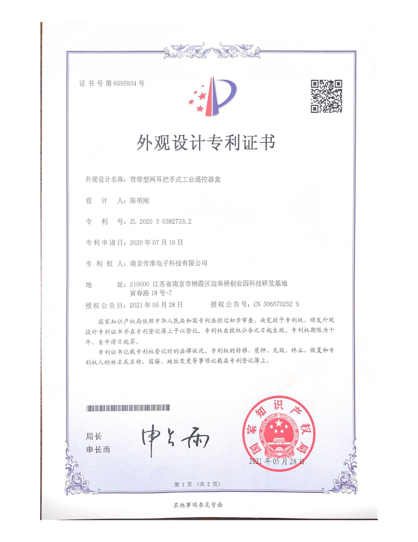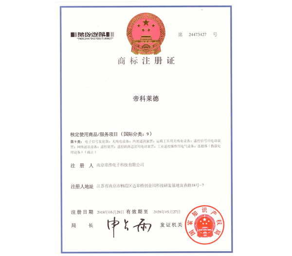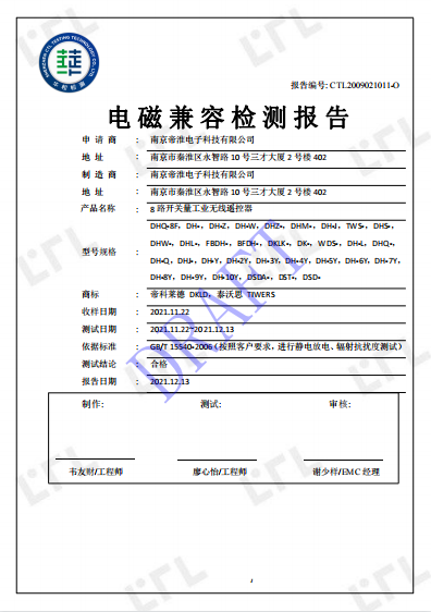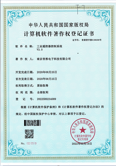 南京帝淮电子科技有限公司,国内工业遥控器行业领军企业,自主研发、定制、非标设计各类工业级无线??仄?、工业级有线控制器、智能化自主算法逻辑的本地控制器等系列产品。已经申请及正在申请的技术专利、外观专利有近三十项左右,并通过了CE欧盟认证、国家级试验检验报告、EMC电磁兼容认证等。